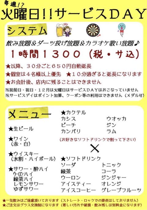 飲み放題&ダーツ投げ放題でおトク‼︎
