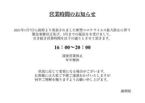 誠酒屋では緊急事態宣言の延長を受けまして、引き続き16:00〜20:00での時短営業とさせて頂きます。