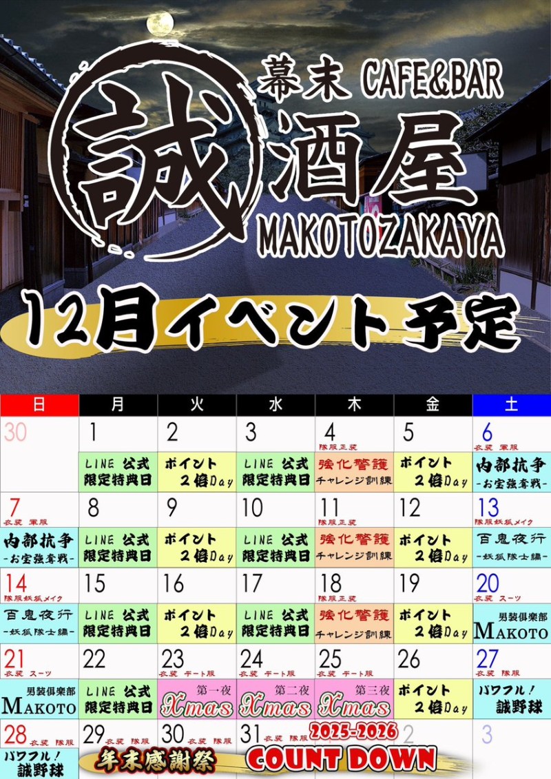 🎄12月イベントカレンダー 秋葉原観光・男装カフェの初体験・女子会・カップル様など大歓迎です🏯🌕 年内ラストも誠酒屋で楽しい時間を過ごしましょう🎅💓 ※日程・内容の調整をする場合があります。 #秋葉原 #男装カフェ #誠酒屋 #男装バイト #TikTok #YouTube #配信 #ツイキャス #求人募集 https://t.co/QWhHhaVJWK