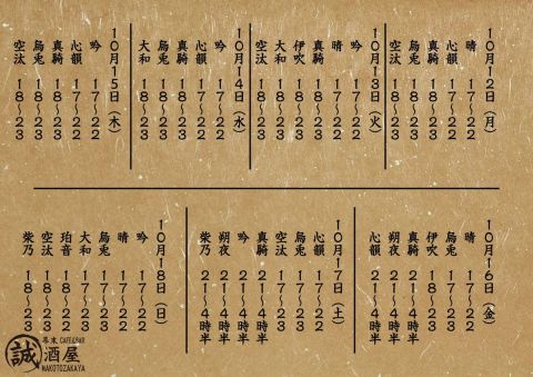 少し遅くなってしまいましたが、誠酒屋今週の訓練予定表です!