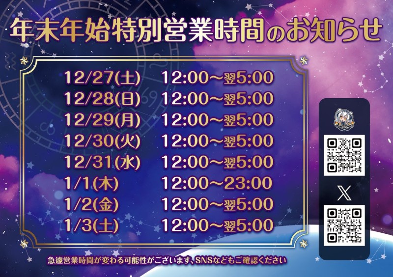 年末年始の特別営業時間と期間中ゲストお給仕に来てくれるキャストのお知らせです♪