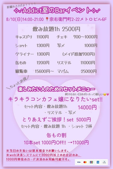 ✚🍻 お知らせ 🍻✚ 倏だお酒だ 肝臓をささげよAddictBarむベント✚ 開催日時 8/10(日) 14:00-21:00 📍旧JOKER 宗右衛門町2-22 メトロビル6F 賑やかにお酒を飲む䌚です い぀もずは違うメむドたちずわいわいお酒を飲みたいご䞻人様方集合〜 楜しい倏の思い出にご来店お埅ちしおたす♡ https://t.co/PYlcTjfffK