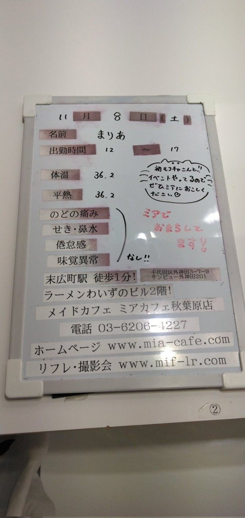👑本日11月7日(金)の総合案内👑 🎀ミアカフェ秋葉原店🎀 おやすみ→次回は11/8(土)、9(日) 🎀ミアカフェ山梨店🎀 おやすみ→次回は11/9(日) 🎀ミアカフェ浜松店🎀 おやすみ→次回は11/8(土)、10(月) 🎀ミアカフェ静岡店🎀 おやすみ→次回は11/8(土)、9(日) #メイドカフェ https://t.co/ELKuDUVll6