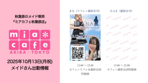 👑本日10月13日(月祝)のミアカフェ秋葉原店