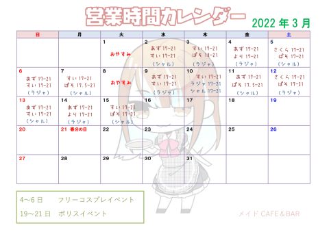 | 営業時間 | 月〜金:バータイム 18時〜23時 土日祝:バータイム 18時〜23時 ナイトタイム 23時〜翌5時 ※新型コロナウイルスの影響により営業時間を変更する場合がございます。 | ||||||||||||||