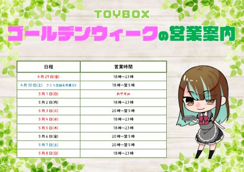 ★ゴールデンウィークの営業案内★ ゴールデンウィークの営業時間のご案内です! ナイト営業多めで少しややこしくなったので、ご来店の際はこちらの画像をご確認くださいませ(*´ω`) https://t.co/CPlNUfVrsd