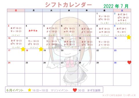 ☆7月のシフトカレンダー☆ 7月1日~15日間のシフトカレンダーです! 7月後半にはマリンイベントとあず生誕がありますので、ぜひチェックしてくださいませ(*´ω`) https://t.co/KVY4qiC7wl