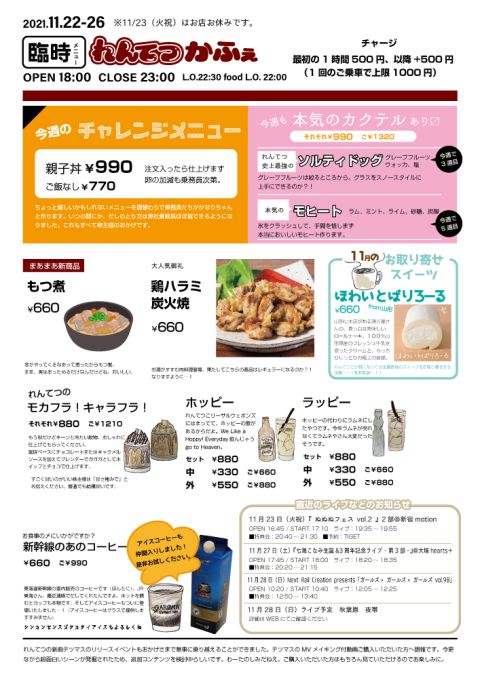 | 営業時間 | 平日 18:00〜23:00(ラストオーダー22:30) 土日祝 不定期営業(Twitterにて情報更新) https://twitter.com/renketsutetsudo 乗務員のシフトはWEBより確認頂けます。 https://rentetsu.net/shift/ | ||||||||||||||