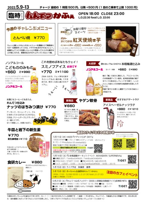 | 営業時間 | 平日 18:00〜23:00(ラストオーダー22:30) 土日祝 不定期営業(Twitterにて情報更新) https://twitter.com/renketsutetsudo 乗務員のシフトはWEBより確認頂けます。 https://rentetsu.net/shift/ | ||||||||||||||