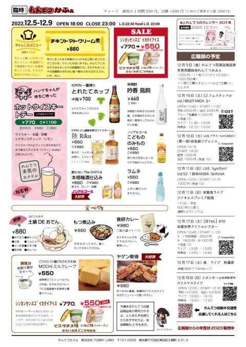 | 営業時間 | 平日 18:00〜23:00(ラストオーダー22:30) 土日祝 不定期営業(Twitterにて情報更新) https://twitter.com/renketsutetsudo 乗務員のシフトはWEBより確認頂けます。 https://rentetsu.net/shift/ | ||||||||||||||