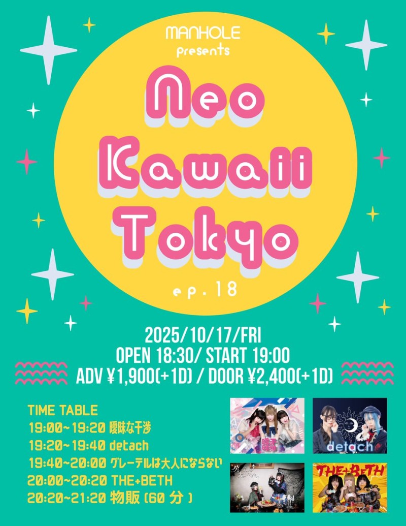 🚧detach出挔情報公開🚧 10/17金MANHOLE presents『Neo Kawaii Tokyo ep.18』 📍浅草橋マンホヌル ⏰OPEN 18:30 / START 19:00 🎀19:20-19:40 📞20:20〜21:20 🎫前売 Â¥1,900 +1D(Â¥600) / 圓日 Â¥2,400 +1D(Â¥600) 🔗https://t.co/i2nOfI2NVR https://t.co/sJe4yPXQJv