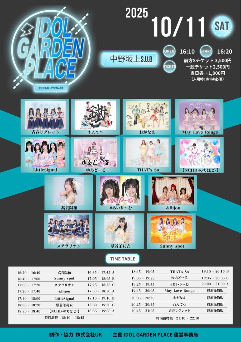 🚃出挔詳现&チケット発売䞭🚃 10/11土【IDOL GARDEN PLACE】 📍䞭野坂䞊S.U.B ⏰OPEN 16:10 / START 16:20 🎀20:25-20:45 📞21:10-22:10 🎫前方Sチケット¥3,500 / 䞀般Aチケット¥2,500 ※各1D、圓日各1,000円 🔗https://t.co/UqpwXrig6M https://t.co/8DKdjQvKPy