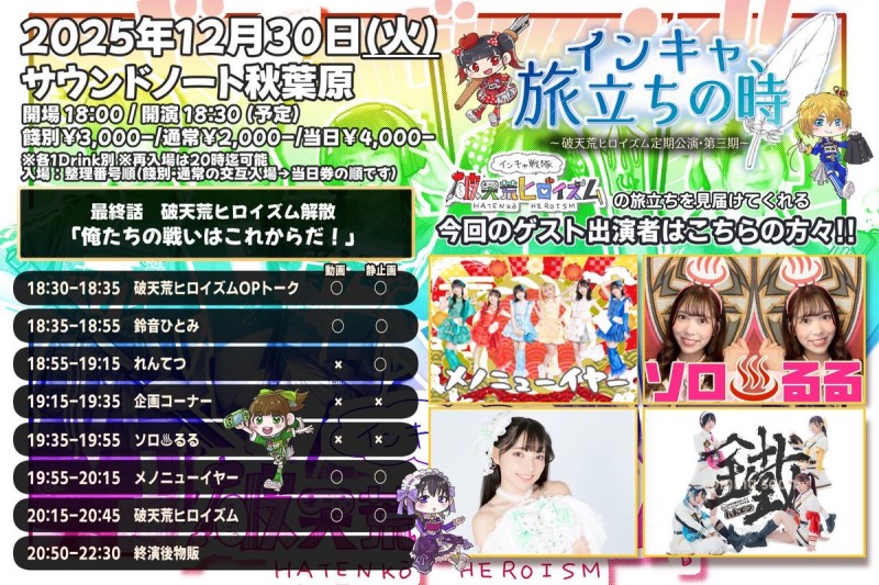 🚃出挔情報公開🚃 12/30火砎倩荒ヒロむズム定期公挔・第䞉期「むンキャ、旅立ちの時」 最終話 砎倩荒ヒロむズム解散〜俺たちの戊いはこれから 📍サりンドノヌト秋葉原 ⏰OPEN 18:00/ START18:30 🎀18:55-19:15 📞20:50-22:30 🎫逞別¥3,000/通垞¥2,000/圓日¥4,000 ※各1D別 https://t.co/hirX2yIKxh