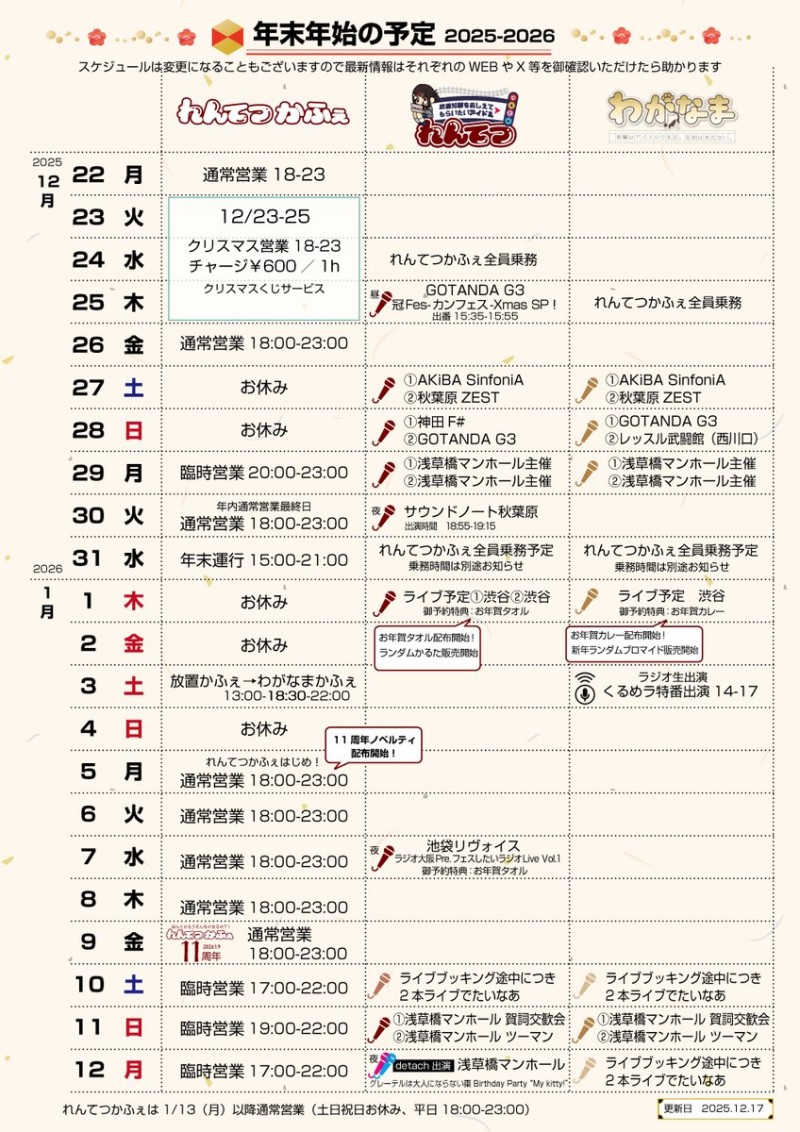 幎末幎始のれんお぀かふぇ、わがなたも掲茉のスケゞュヌル早芋衚を䜜りたしたのでご参考たでにぜひどうぞ。 ※倉曎になる堎合もございたすので最新情報はWEBやXもぜひチェックしおみおください https://t.co/hsAjmG2Dhf