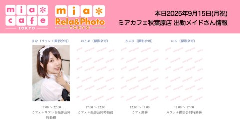 | å¶æ¥æé | âãã¢ã«ãã§æ±äº¬åºïŒã¡ã€ãã«ãã§ïŒhttp://www.mia-cafe.com/ãâ â¡å¹³æ¥ãæïœéãïŒïŒïŒïŒïŒïœïŒïŒïŒïŒïŒ â¡åæã»æ¥æã»ç¥æ¥ãïŒïŒïŒïŒïŒïœïŒïŒïŒïŒïŒ â å®äŒæ¥ããªãïŒ2019幎1æããå®äŒæ¥å»æ¢ïŒ â¡ã©ã¹ããªãŒããŒãéåºã®ïŒïŒåå ãïŒïŒïŒïŒïŒéåºã®å ŽåâïŒïŒïŒïŒïŒã©ã¹ããªãŒããŒ å¶æ¥æ¥ãåºå€ç¶æ³ã«ã€ããŠã¯ãã¡ãã http://pandaland.cutegirl.jp/mif/c_cms_csv/sch_top.php âãã¢ãªã©ïŒãã©ãæ±äº¬åºïŒæ®åœ±äŒïŒãªãã¬ïŒhttp://www.mif-lr.com/ãâ â¡å šæ¥ãïŒïŒïŒïŒïŒãïŒïŒïŒïŒïŒãã§ãããªã©ã¯ãŒãŒã·ã§ã³åºå€ã¹ã¿ãããããæé垯ã®ã¿å¶æ¥ã§ãã â å®äŒæ¥ã¯äžå®äŒïŒåºå€ã¹ã¿ãããããæé垯ã®å¶æ¥ïŒ â¡æçµåä»ãéåºã®ïŒïŒåå ãïŒïŒïŒïŒïŒéåºã®å ŽåâïŒïŒïŒïŒïŒïŒïŒïŒïŒïŒïŒè¿ã«æœè¡æéãçµããã³ãŒã¹ïŒ â»é«æ ¡çäžå¯ âæ·±å€å¶æ¥ã«ã€ããŠã¯ãå ¬åŒãµã€ãå³äžã® http://market.chu.jp/schedule1/sche37.cgi ãã¢ã°ã«ãŒãç·åã¹ã±ãžã¥ãŒã«ïŒïŒ°ïŒ£ã»ã¹ããïŒ http://market.chu.jp/schedule1/sche37.cgi?dm=1 ãã¢ã°ã«ãŒãç·åã¹ã±ãžã¥ãŒã«ïŒã¬ã©æºåž¯ïŒ ãã芧ãã ãããåç¥æ¥ã®ã¿å¶æ¥ãšãªããŸããåç¥æ¥ä»¥å€ã¯æ·±å€å¶æ¥ããããŠãããŸããã æ·±å€å¶æ¥å¯Ÿè±¡æ¥ãïŒïŒïŒïŒïŒãç¿æïŒïŒïŒïŒïŒïŒ¬ïŒïŒ¯ïŒïŒïŒïŒïŒïŒ | ||||||||||||||