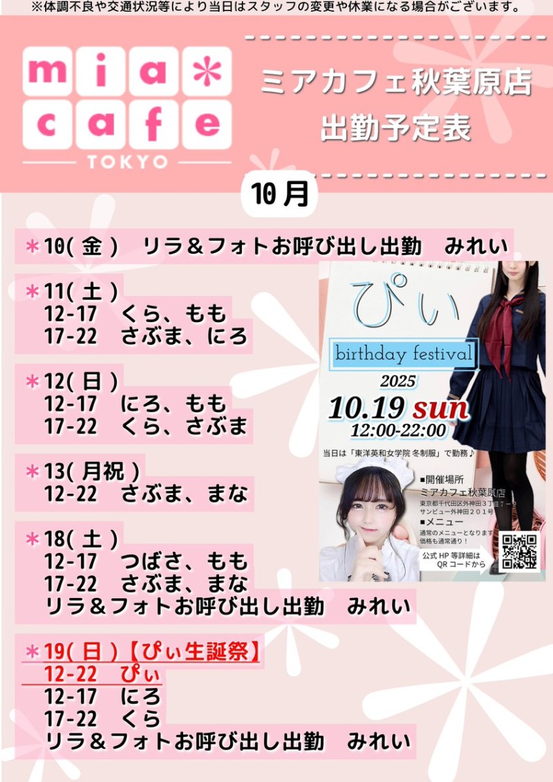å¶æ¥æé | âãã¢ã«ãã§æ±äº¬åºïŒã¡ã€ãã«ãã§ïŒhttp://www.mia-cafe.com/ãâ â¡å¹³æ¥ãæïœéãïŒïŒïŒïŒïŒïœïŒïŒïŒïŒïŒ â¡åæã»æ¥æã»ç¥æ¥ãïŒïŒïŒïŒïŒïœïŒïŒïŒïŒïŒ â å®äŒæ¥ããªãïŒ2019幎1æããå®äŒæ¥å»æ¢ïŒ â¡ã©ã¹ããªãŒããŒãéåºã®ïŒïŒåå ãïŒïŒïŒïŒïŒéåºã®å ŽåâïŒïŒïŒïŒïŒã©ã¹ããªãŒããŒ å¶æ¥æ¥ãåºå€ç¶æ³ã«ã€ããŠã¯ãã¡ãã http://pandaland.cutegirl.jp/mif/c_cms_csv/sch_top.php âãã¢ãªã©ïŒãã©ãæ±äº¬åºïŒæ®åœ±äŒïŒãªãã¬ïŒhttp://www.mif-lr.com/ãâ â¡å šæ¥ãïŒïŒïŒïŒïŒãïŒïŒïŒïŒïŒãã§ãããªã©ã¯ãŒãŒã·ã§ã³åºå€ã¹ã¿ãããããæé垯ã®ã¿å¶æ¥ã§ãã â å®äŒæ¥ã¯äžå®äŒïŒåºå€ã¹ã¿ãããããæé垯ã®å¶æ¥ïŒ â¡æçµåä»ãéåºã®ïŒïŒåå ãïŒïŒïŒïŒïŒéåºã®å ŽåâïŒïŒïŒïŒïŒïŒïŒïŒïŒïŒïŒè¿ã«æœè¡æéãçµããã³ãŒã¹ïŒ â»é«æ ¡çäžå¯ âæ·±å€å¶æ¥ã«ã€ããŠã¯ãå ¬åŒãµã€ãå³äžã® http://market.chu.jp/schedule1/sche37.cgi ãã¢ã°ã«ãŒãç·åã¹ã±ãžã¥ãŒã«ïŒïŒ°ïŒ£ã»ã¹ããïŒ http://market.chu.jp/schedule1/sche37.cgi?dm=1 ãã¢ã°ã«ãŒãç·åã¹ã±ãžã¥ãŒã«ïŒã¬ã©æºåž¯ïŒ ãã芧ãã ãããåç¥æ¥ã®ã¿å¶æ¥ãšãªããŸããåç¥æ¥ä»¥å€ã¯æ·±å€å¶æ¥ããããŠãããŸããã æ·±å€å¶æ¥å¯Ÿè±¡æ¥ãïŒïŒïŒïŒïŒãç¿æïŒïŒïŒïŒïŒïŒ¬ïŒïŒ¯ïŒïŒïŒïŒïŒïŒ | ||||||||||||||