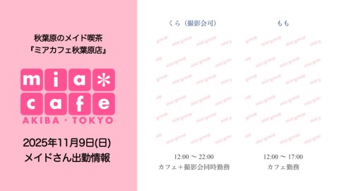 ★メむドカフェ・ミアカフェ #秋葉原 店★ ☕営業予定日☕ 🎀11月15日(土)  12-17 くら  17-22 にろ,たな 🎀11月16日(日)  12-17 もこちゃ,りがん  17-22 くら,たな 🩺ピンク゜ヌダ #ナヌス りィヌク🩺 💗11月22日(土)  12-17 有栖川でる【初お絊仕】,たな  17-22 にろ,くら #看護婊 https://t.co/wn7YZPv1Sy
