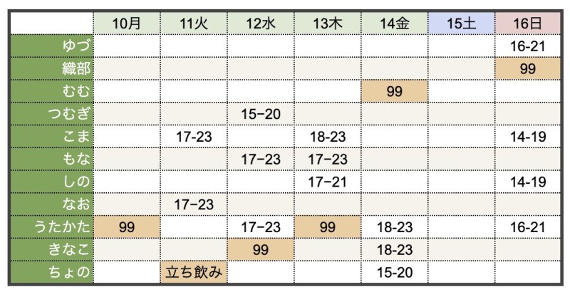 | 営業時間 | 18:00〜 | ||||||||||||||