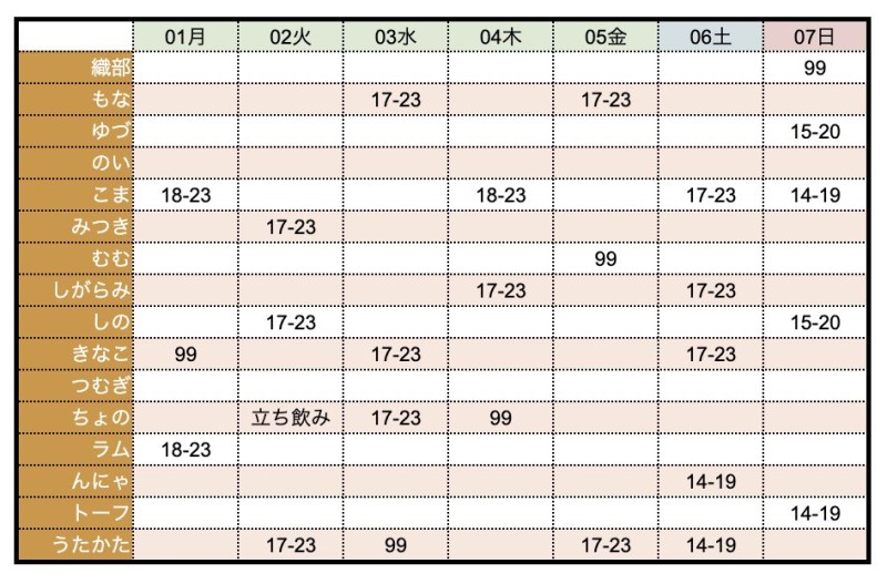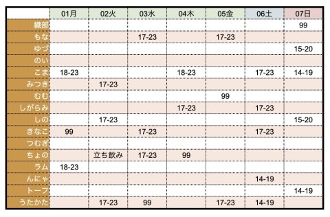 | 営業時間 | 18:00〜 | ||||||||||||||