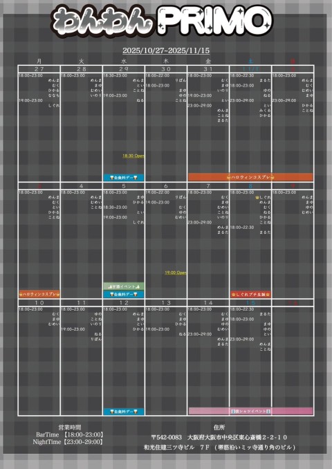 | 営業時間 | 月~日 18~23 金、土 23~29(不定期) | ||||||||||||||