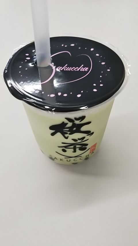 仕事の合間に、抹茶のタピオカを飲む店長。