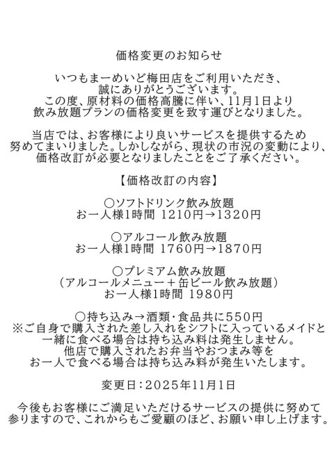 いつもまーめいど梅田店をご利用いただき、誠にありがとうございます。
