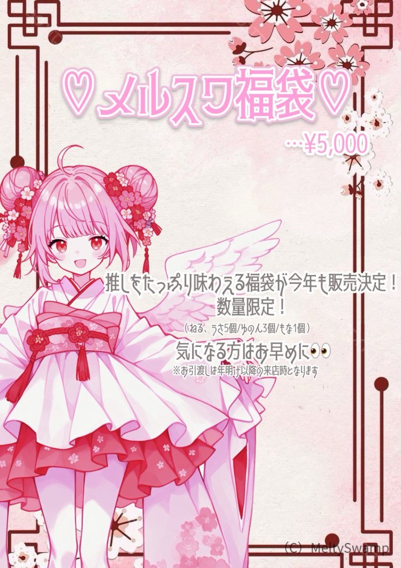 🎍メルスワ福袋&年賀状販売🐴 12/1(月)17:00〜店頭予約開始 12/8(月)0:00〜オンライン予約開始 今年もメルスワ福袋と年賀状販売‼️ 福袋¥5,000と年賀状¥1,000をセット購入で500円OFF 数量限定なのでお早めに! #コンカフェ #メルスワ #町田 https://t.co/c5rDDQemaw