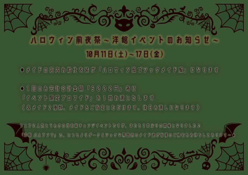 本日もご帰宅ありがとうございました💗 次の営業日時は 【10月26日】【12:00〜22:00】 お留守番予定メイドは 🌙まりあ 🌙こおり(13〜21) 🌙りりな(〜20) 🌙つばめ(15〜) でございます🎵 「ハロウィンイベント」開催中です🎃👻 フリーコスプレ姿で皆様のご帰宅をお待ちしております☺️🦇❤ https://t.co/zZhv4V6KHM