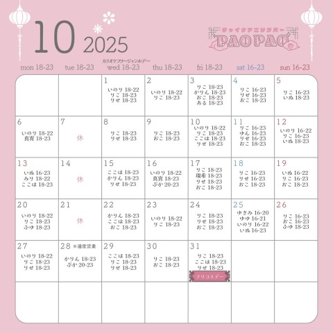 🐼10月の予定🐼 🎤毎週水曜日カラオケフリージャンルデー 【イベント】 31日フリコスデー ⚠️店休日:毎週火曜 ✨キャスト募集中✨🔽詳細 https://t.co/K452bx24o7 🎀姉妹店🎀 @melfi_maid 予定変更やイベント詳細はスレッドにて🔽 https://t.co/p2Dtqhhda6