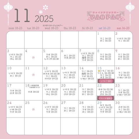 | 営業時間 | 【2021年7月2日オープン予定】 月曜18:00〜23:00 金曜23:00〜翌5:00 土曜23:00〜翌5:00 | ||||||||||||||