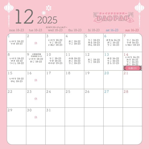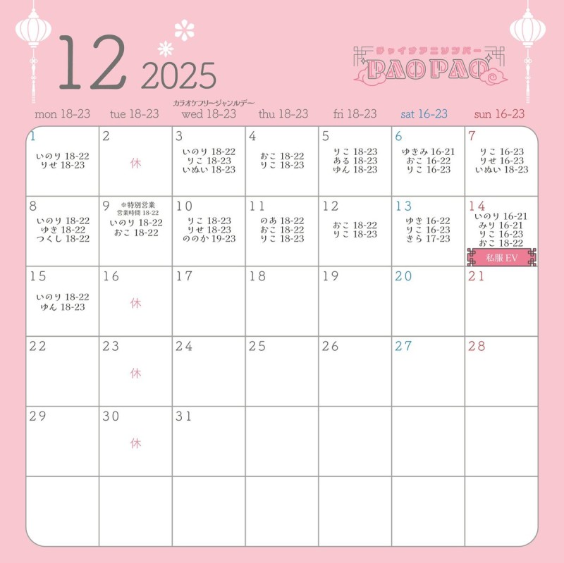 | 営業時間 | 【2021年7月2日オープン予定】 月曜18:00〜23:00 金曜23:00〜翌5:00 土曜23:00〜翌5:00 | ||||||||||||||