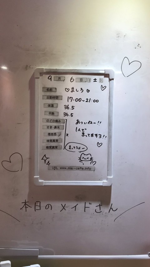 | 営業時間 | 静岡店は出勤スタッフがいれば営業です! 基本的に 12時~22時が営業時間です! ●静岡店のツイッター @shizuokamaidsan https://twitter.com/shizuokamaidsan ●ミア静岡店の営業曜日&営業時間● ☆月〜木 14:00〜22:00(最終受付20:00) ☆金曜日 12:00〜22:00(最終受付21:00) ☆土・日・祝 12:00〜22:00(最終受付21:00) 営業時間外はオンライン予約にてお願いいたします。 PC・携帯共通 → http://m-kanzume.moo.jp/yoyaku2/user.cgi ●ミアガイド出勤状況● スマホ・PC → 後日公開予定 ★静岡店スタッフによるミア甲府店でのメイドカフェリアル営業★ ☆不定期 サイトにてご確認ください。 http://market.chu.jp/schedule1/sche37.cgi | ||||||||||||||