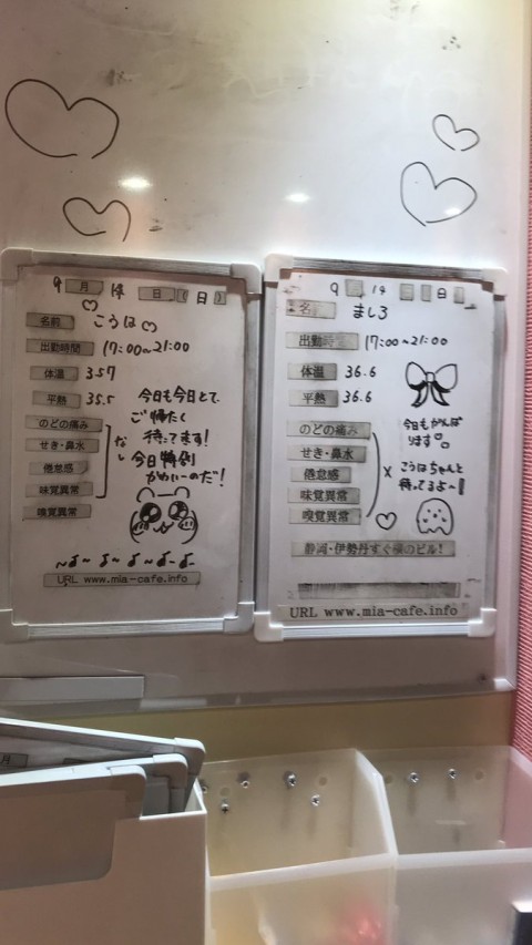 営業時間 静岡店は出勤スタッフがいれば営業です! 基本的に 12時~22時が営業時間です! ●静岡店のツイッター @shizuokamaidsan https://twitter.com/shizuokamaidsan ●ミア静岡店の営業曜日&営業時間● ☆月〜木 14:00〜22:00(最終受付20:00) ☆金曜日 12:00〜22:00(最終受付21:00) ☆土・日・祝 12:00〜22:00(最終受付21:00) 営業時間外はオンライン予約にてお願いいたします。 PC・携帯共通 → http://m-kanzume.moo.jp/yoyaku2/user.cgi ●ミアガイド出勤状況● スマホ・PC → 後日公開予定 ★静岡店スタッフによるミア甲府店でのメイドカフェリアル営業★ ☆不定期  サイトにてご確認ください。  http://market.chu.jp/schedule1/sche37.cgi
