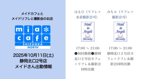 | 営業時間 | 静岡店は出勤スタッフがいれば営業です! 基本的に 12時~22時が営業時間です! ●静岡店のツイッター @shizuokamaidsan https://twitter.com/shizuokamaidsan ●ミア静岡店の営業曜日&営業時間● ☆月〜木 14:00〜22:00(最終受付20:00) ☆金曜日 12:00〜22:00(最終受付21:00) ☆土・日・祝 12:00〜22:00(最終受付21:00) 営業時間外はオンライン予約にてお願いいたします。 PC・携帯共通 → http://m-kanzume.moo.jp/yoyaku2/user.cgi ●ミアガイド出勤状況● スマホ・PC → 後日公開予定 ★静岡店スタッフによるミア甲府店でのメイドカフェリアル営業★ ☆不定期 サイトにてご確認ください。 http://market.chu.jp/schedule1/sche37.cgi | ||||||||||||||