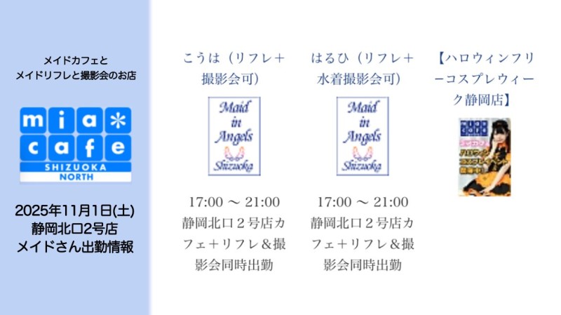 ★メイドカフェ・ミアカフェ #静岡 店★ ☕️営業予定日☕️ 🧙‍♀️ハロウィンフリーコスプレ🧙‍♀️ 🎃11月1日(土) 17-21 こうは,はるひ,みちゃ 🎃11月2日(日) 17-21 🔰あおね初回勤務🔰,こうは,みちゃ 💖11月8日(土) 17-21 こうは,ましろ 💖11月9日(日) 17-21 えみりあ,こうは #コンカフェ営業ください https://t.co/KTvUMzt27t