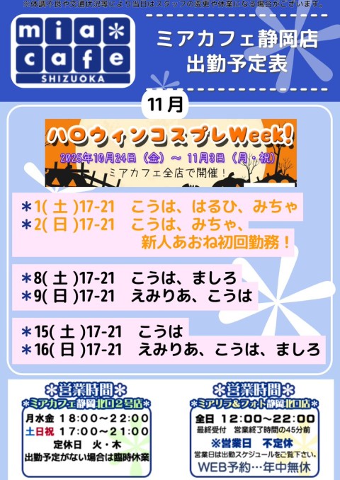 ★メイドカフェ・ミアカフェ静岡店★ ☕️営業予定日☕️ 👻ハロウィンフリーコスウィーク24~3日👻 🎃10月25日(土) 17-21 こうは・ましろ・みちゃ 🎃10月26日(日) 17-21 こうは・ましろ・みちゃ 🎃11月1日(土) 17-21 こうは・はるひ 🎃11月2日(日) 17-21 こうは・はるひ・みちゃ・🔰あおね初勤務 https://t.co/XPhHr0YsPz