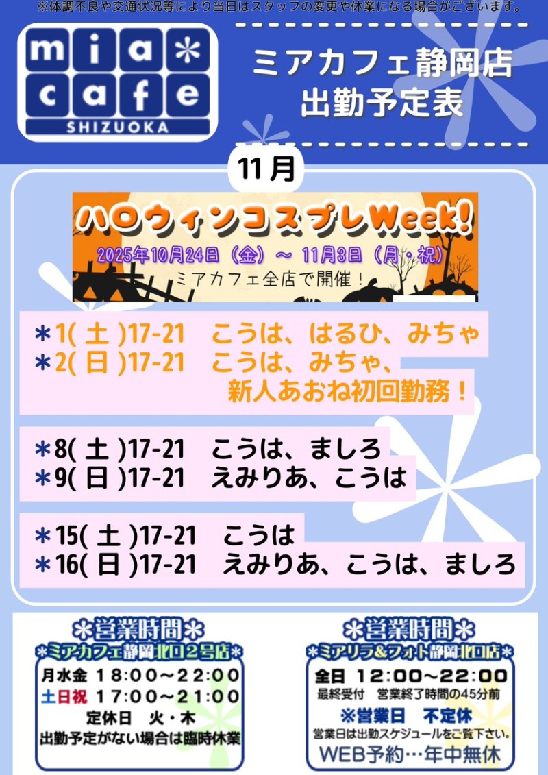 ★メイドカフェ・ミアカフェ #静岡 店★ ☕️営業予定日☕️ 🧙‍♀️ハロウィンフリーコスプレ🧙‍♀️ 🎃11月1日(土) 17-21 こうは,はるひ,みちゃ 🎃11月2日(日) 17-21 🔰あおね初回勤務🔰,こうは,みちゃ 💖11月8日(土) 17-21 こうは,ましろ 💖11月9日(日) 17-21 えみりあ,こうは #コンカフェ営業ください https://t.co/KTvUMzt27t