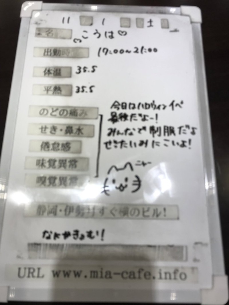 | 営業時間 | 静岡店は出勤スタッフがいれば営業です! 基本的に 12時~22時が営業時間です! ●静岡店のツイッター @shizuokamaidsan https://twitter.com/shizuokamaidsan ●ミア静岡店の営業曜日&営業時間● ☆月〜木 14:00〜22:00(最終受付20:00) ☆金曜日 12:00〜22:00(最終受付21:00) ☆土・日・祝 12:00〜22:00(最終受付21:00) 営業時間外はオンライン予約にてお願いいたします。 PC・携帯共通 → http://m-kanzume.moo.jp/yoyaku2/user.cgi ●ミアガイド出勤状況● スマホ・PC → 後日公開予定 ★静岡店スタッフによるミア甲府店でのメイドカフェリアル営業★ ☆不定期 サイトにてご確認ください。 http://market.chu.jp/schedule1/sche37.cgi | ||||||||||||||