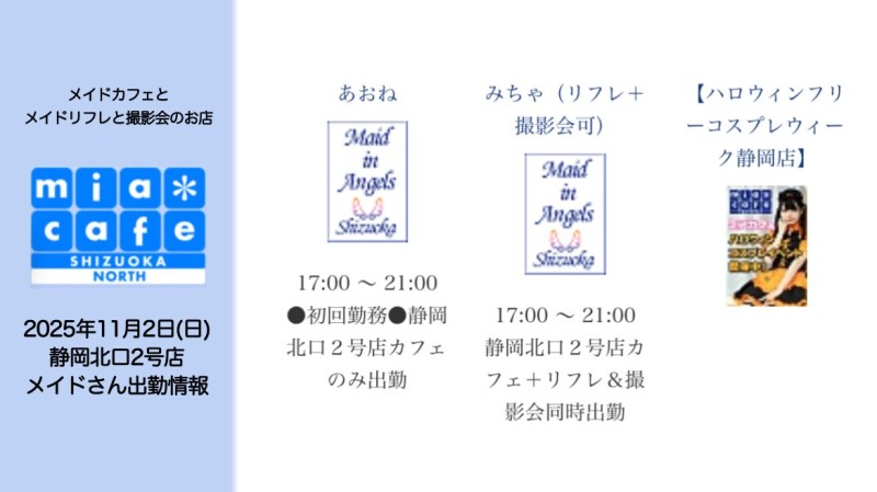 ★メイドカフェ・ミアカフェ #静岡 店★ ☕️営業予定日☕️ 🧙‍♀️ハロウィンフリーコスプレ🧙‍♀️ 🎃11月1日(土) 17-21 こうは,はるひ,みちゃ 🎃11月2日(日) 17-21 🔰あおね初回勤務🔰,こうは,みちゃ 💖11月8日(土) 17-21 こうは,ましろ 💖11月9日(日) 17-21 えみりあ,こうは #コンカフェ営業ください https://t.co/KTvUMzt27t