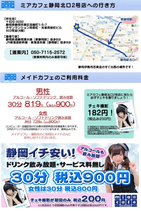 | 営業時間 | 静岡店は出勤スタッフがいれば営業です! 基本的に 12時~22時が営業時間です! ●静岡店のツイッター @shizuokamaidsan https://twitter.com/shizuokamaidsan ●ミア静岡店の営業曜日&営業時間● ☆月〜木 14:00〜22:00(最終受付20:00) ☆金曜日 12:00〜22:00(最終受付21:00) ☆土・日・祝 12:00〜22:00(最終受付21:00) 営業時間外はオンライン予約にてお願いいたします。 PC・携帯共通 → http://m-kanzume.moo.jp/yoyaku2/user.cgi ●ミアガイド出勤状況● スマホ・PC → 後日公開予定 ★静岡店スタッフによるミア甲府店でのメイドカフェリアル営業★ ☆不定期 サイトにてご確認ください。 http://market.chu.jp/schedule1/sche37.cgi | ||||||||||||||