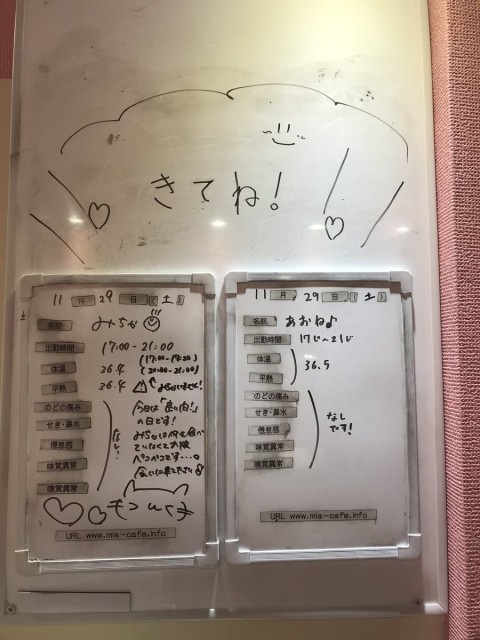 | 営業時間 | 静岡店は出勤スタッフがいれば営業です! 基本的に 12時~22時が営業時間です! ●静岡店のツイッター @shizuokamaidsan https://twitter.com/shizuokamaidsan ●ミア静岡店の営業曜日&営業時間● ☆月〜木 14:00〜22:00(最終受付20:00) ☆金曜日 12:00〜22:00(最終受付21:00) ☆土・日・祝 12:00〜22:00(最終受付21:00) 営業時間外はオンライン予約にてお願いいたします。 PC・携帯共通 → http://m-kanzume.moo.jp/yoyaku2/user.cgi ●ミアガイド出勤状況● スマホ・PC → 後日公開予定 ★静岡店スタッフによるミア甲府店でのメイドカフェリアル営業★ ☆不定期 サイトにてご確認ください。 http://market.chu.jp/schedule1/sche37.cgi | ||||||||||||||