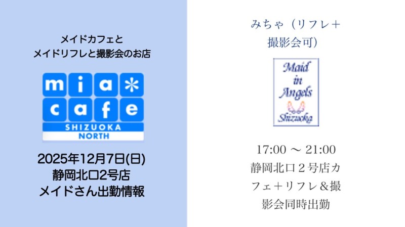 | 営業時間 | 静岡店は出勤スタッフがいれば営業です! 基本的に 12時~22時が営業時間です! ●静岡店のツイッター @shizuokamaidsan https://twitter.com/shizuokamaidsan ●ミア静岡店の営業曜日&営業時間● ☆月〜木 14:00〜22:00(最終受付20:00) ☆金曜日 12:00〜22:00(最終受付21:00) ☆土・日・祝 12:00〜22:00(最終受付21:00) 営業時間外はオンライン予約にてお願いいたします。 PC・携帯共通 → http://m-kanzume.moo.jp/yoyaku2/user.cgi ●ミアガイド出勤状況● スマホ・PC → 後日公開予定 ★静岡店スタッフによるミア甲府店でのメイドカフェリアル営業★ ☆不定期 サイトにてご確認ください。 http://market.chu.jp/schedule1/sche37.cgi | ||||||||||||||
