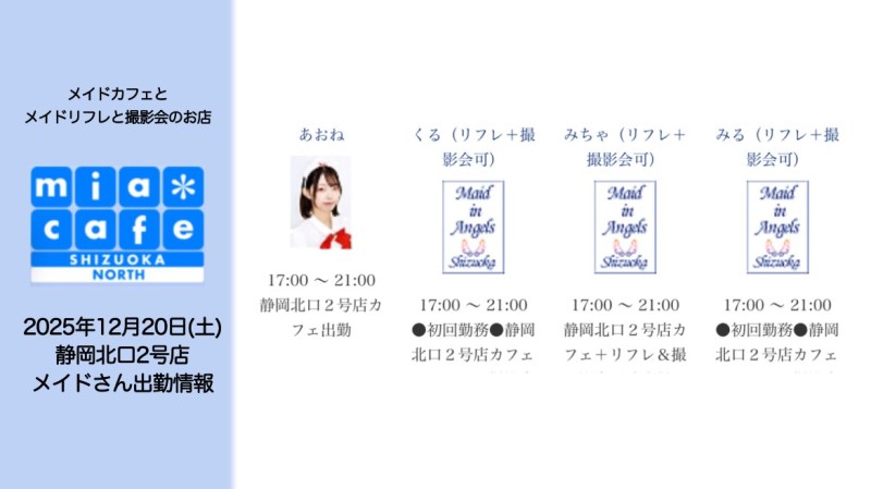 | å¶æ¥æé | é岡åºã¯åºå€ã¹ã¿ãããããã°å¶æ¥ã§ãïŒ åºæ¬çã«ã12æïœ22æãå¶æ¥æéã§ãïŒ âé岡åºã®ãã€ãã¿ãŒã@shizuokamaidsan https://twitter.com/shizuokamaidsan âãã¢é岡åºã®å¶æ¥ææ¥ïŒå¶æ¥æéâ âæãæšã14:00ã22:00(æçµåä»20:00) âéææ¥ã12:00ã22:00(æçµåä»21:00) âåã»æ¥ã»ç¥ã12:00ã22:00(æçµåä»21:00) å¶æ¥æéå€ã¯ãªã³ã©ã€ã³äºçŽã«ãŠãé¡ãããããŸãã ïŒ°ïŒ£ã»æºåž¯å ±éãâãhttp://m-kanzume.moo.jp/yoyaku2/user.cgi âãã¢ã¬ã€ãåºå€ç¶æ³â ã¹ããã»ïŒ°ïŒ£ãâãåŸæ¥å ¬éäºå® â é岡åºã¹ã¿ããã«ãããã¢ç²åºåºã§ã®ã¡ã€ãã«ãã§ãªã¢ã«å¶æ¥â âäžå®æ ããµã€ãã«ãŠã確èªãã ããã ãhttp://market.chu.jp/schedule1/sche37.cgi | ||||||||||||||