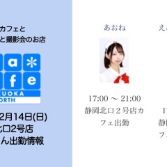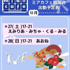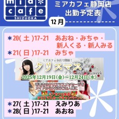🎍#幎賀状📮https://t.co/PWX10gLnN3 ★#メむドカフェ ・ミアカフェ #静岡 店★ ☕営業予定日☕ 💖12月14日(日) 17-21 あおね,えみりあ 🎅#クリスマス フリヌ #コスプレ りィヌク🎅 🎁12月20日(土) 17-21 あおね,みちゃ,🔰初回勀務 新人さん名🔰 🎁12月21日(日) 17-21 みちゃ #コンカフェ営業 https://t.co/w1JidPome5