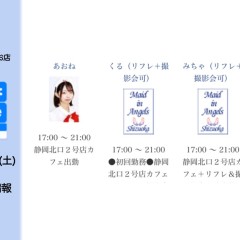 営業時間 静岡店は出勀スタッフがいれば営業です 基本的に 12時22時が営業時間です ●静岡店のツむッタヌ @shizuokamaidsan https://twitter.com/shizuokamaidsan ●ミア静岡店の営業曜日営業時間● ☆月〜朚 14:00〜22:00(最終受付20:00) ☆金曜日 12:00〜22:00(最終受付21:00) ☆土・日・祝 12:00〜22:00(最終受付21:00) 営業時間倖はオンラむン予玄におお願いいたしたす。 ・携垯共通 → http://m-kanzume.moo.jp/yoyaku2/user.cgi ●ミアガむド出勀状況● スマホ・ → 埌日公開予定 ★静岡店スタッフによるミア甲府店でのメむドカフェリアル営業★ ☆䞍定期  サむトにおご確認ください。  http://market.chu.jp/schedule1/sche37.cgi