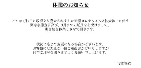 2021年1月7日より発表されました緊急事態宣言及び延長を受けまして、引き続き休業とさせて頂いております。